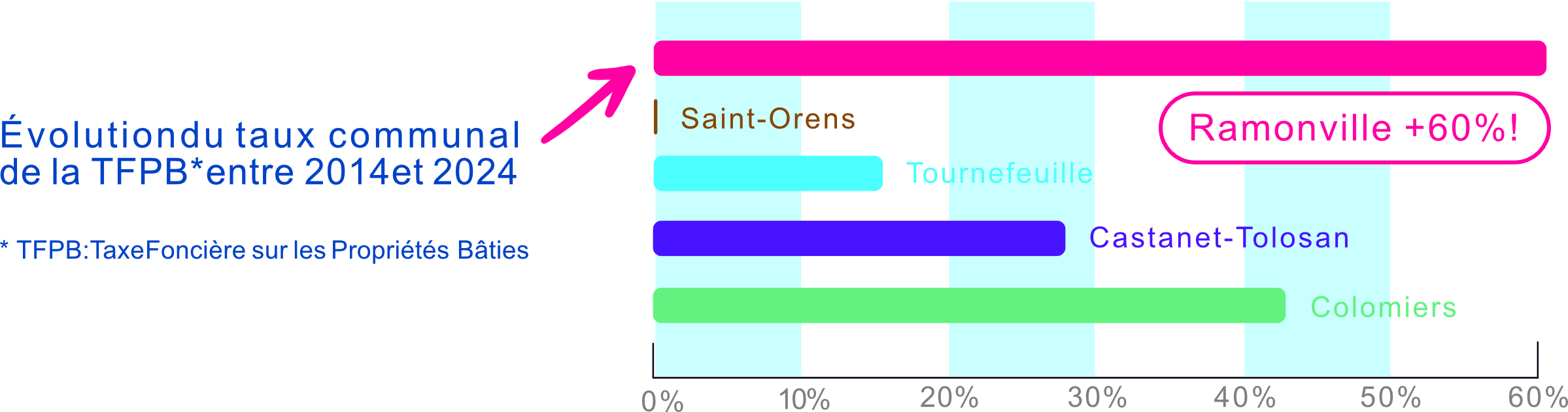 + 60% d’augmentation du taux de taxe foncière depuis 2014 ! D’autres communes ont pourtant réussi à ne pas augmenter les impôts, et ce, malgré la suppression de la taxe d’habitation que nous déplorons.