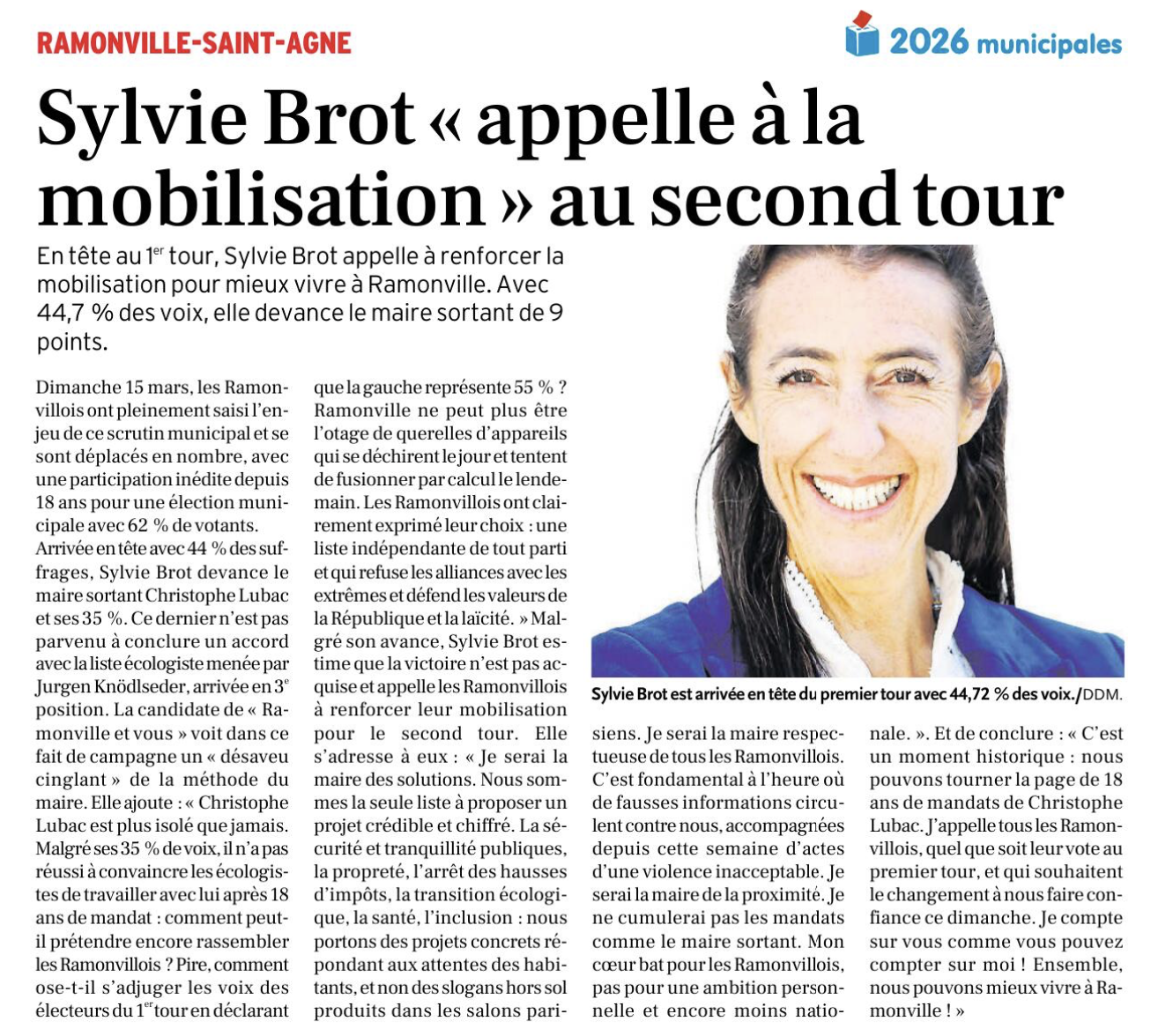 La Dépêche du Midi, 19 mars 2026. https://www.ladepeche.fr/2026/03/19/sylvie-brot-appelle-a-la-mobilisation-au-second-tour-13280304.php