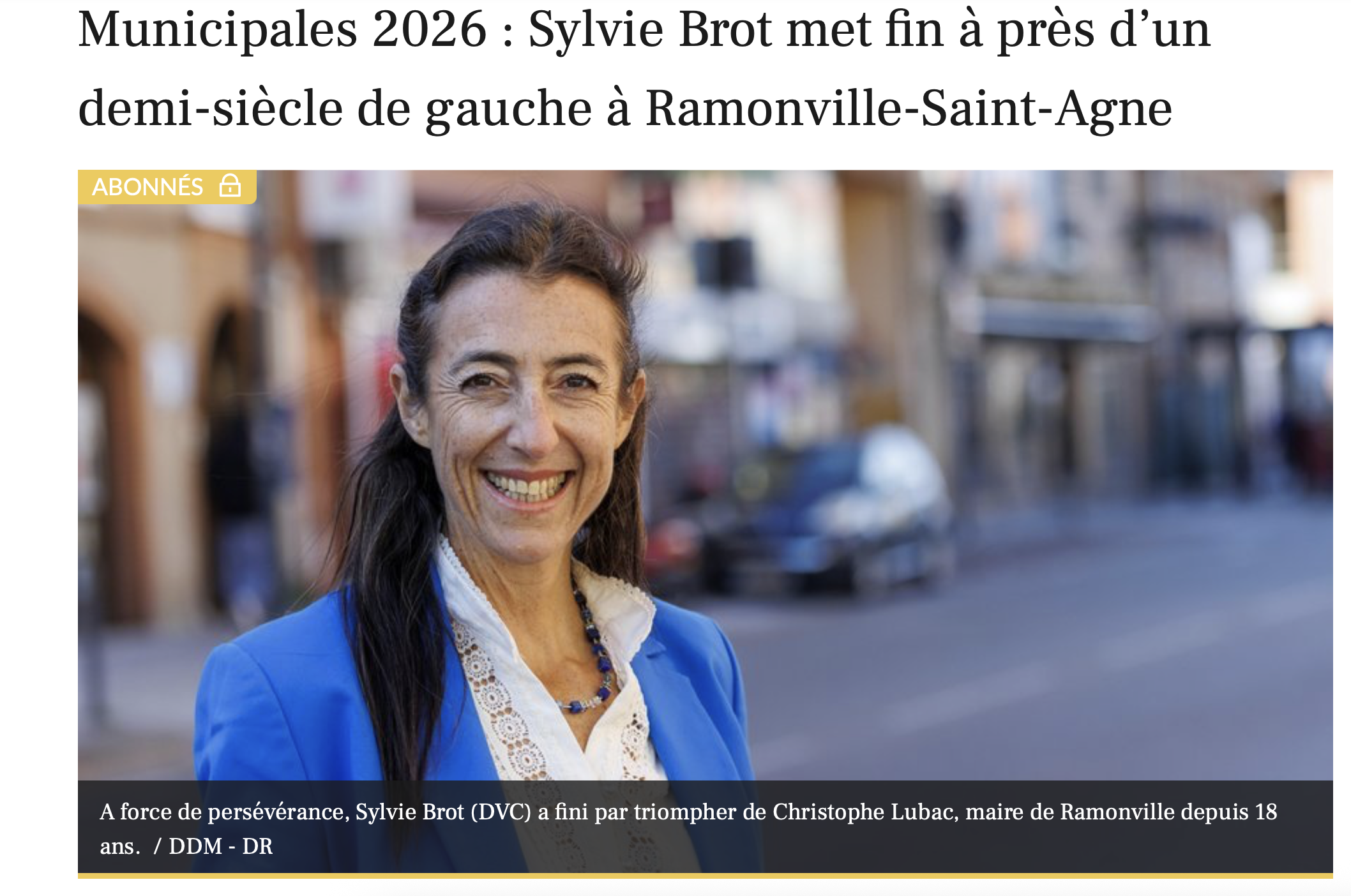 La Dépêche du Midi, 24 mars 2026. https://www.ladepeche.fr/2026/03/23/municipales-2026-sylvie-brot-met-fin-a-pres-dun-demi-siecle-de-gauche-a-ramonville-saint-agne-13288423.php