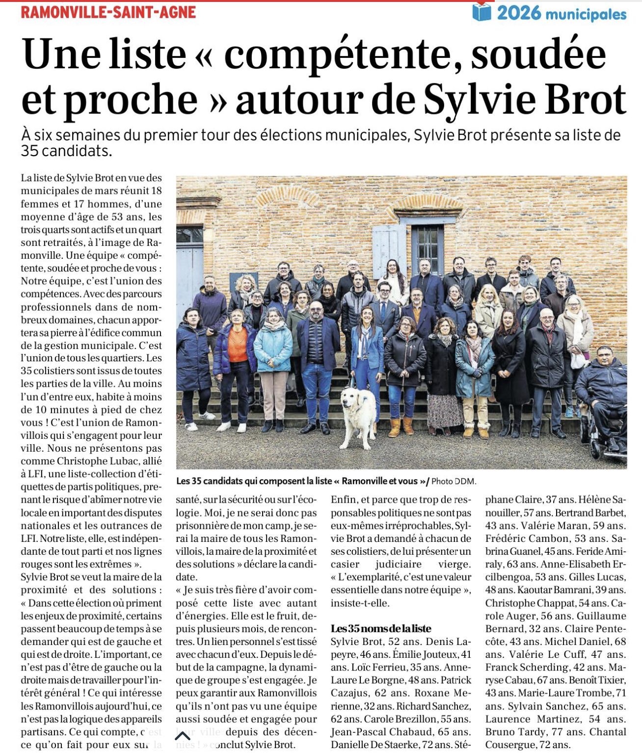 La Dépêche du Midi, 29 janvier 2026. https://www.ladepeche.fr/2026/01/29/une-liste-competente-soudee-et-proche-autour-de-sylvie-brot-13194825.php