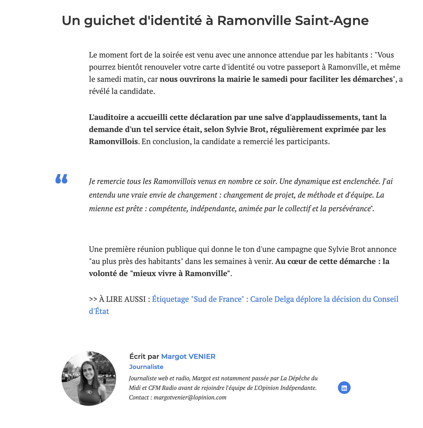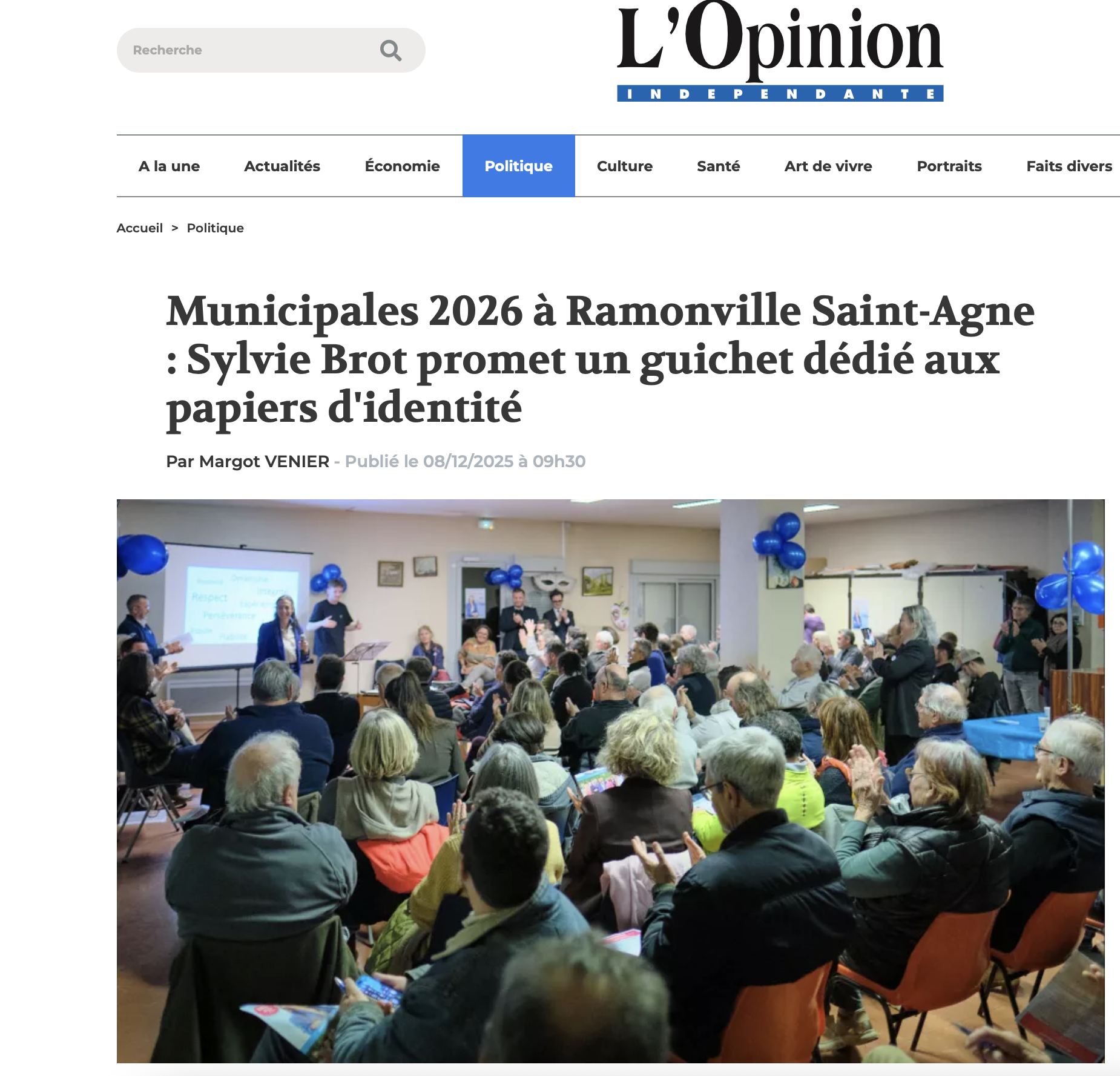 L’Opinion Indépendante, 8 décembre 2025. A lire ici : https://lopinion.com/articles/politique/31433_municipales-2026-ramonville-saint-agne-sylvie-brot-guichet-papiers-identite