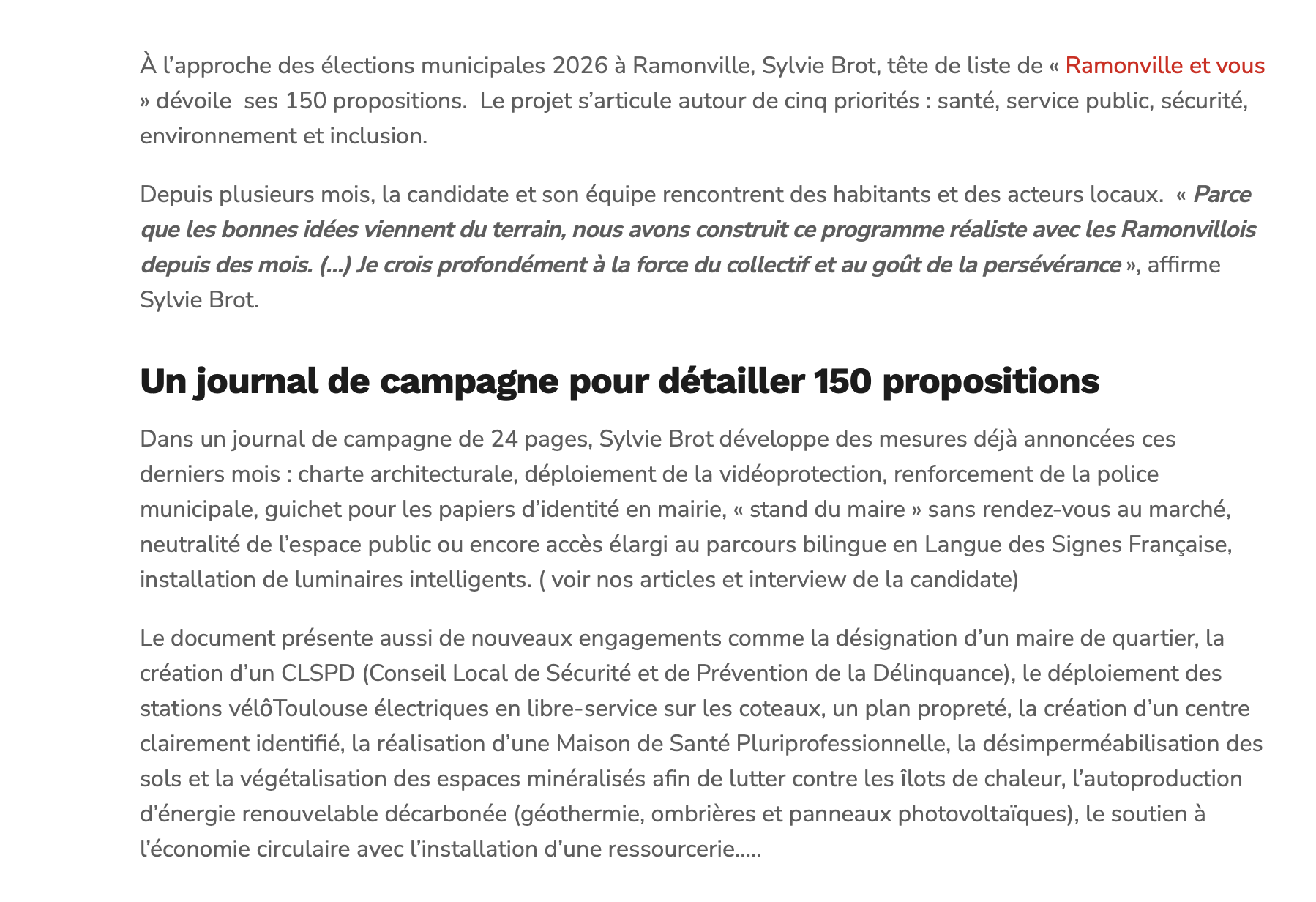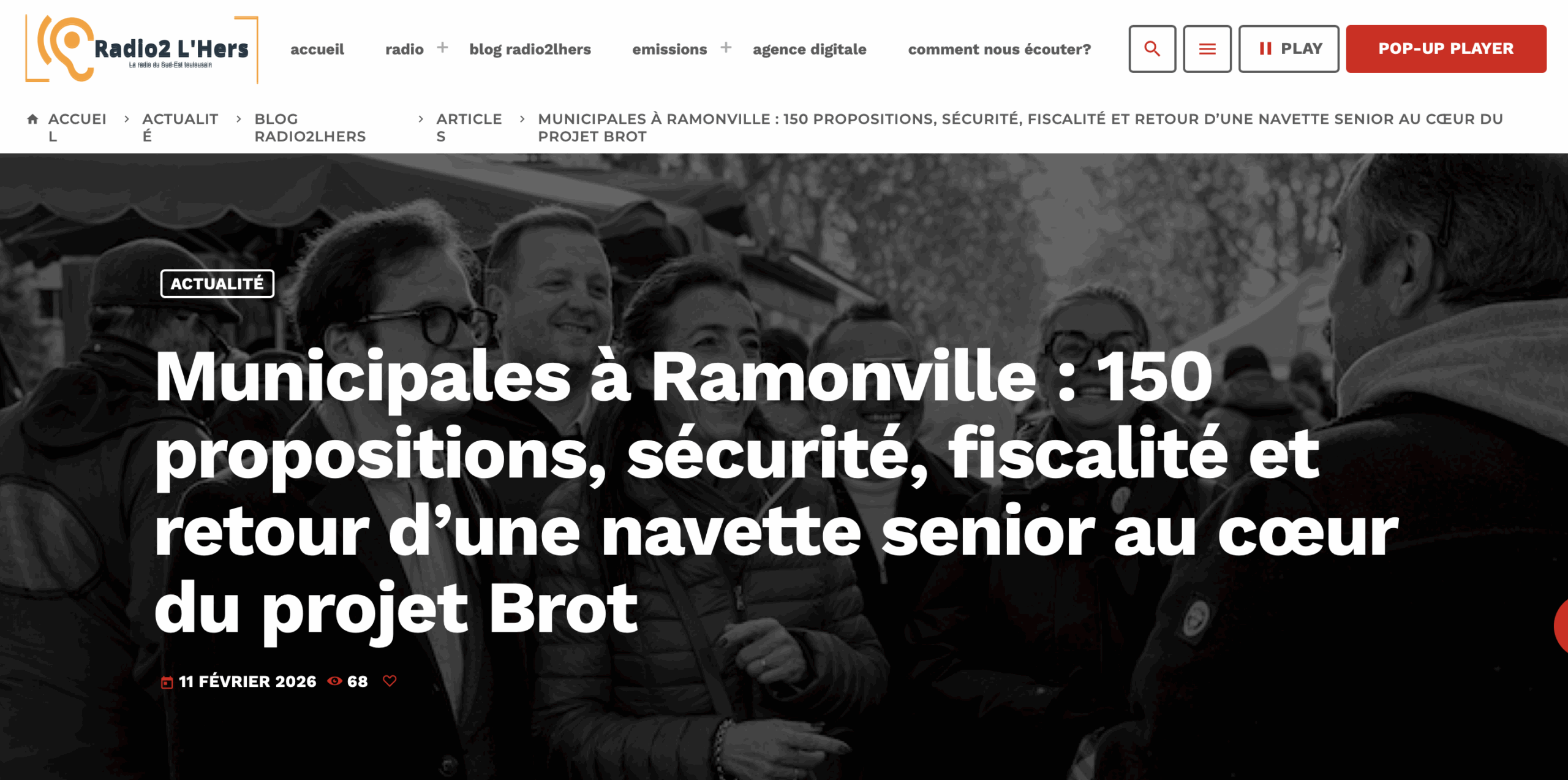 Radio2LHers, 11 février 2026. https://radio2lhers.fr/municipales-a-ramonville-150-propositions-securite-fiscalite-et-retour-dune-navette-senior-au-coeur-du-projet-brot/