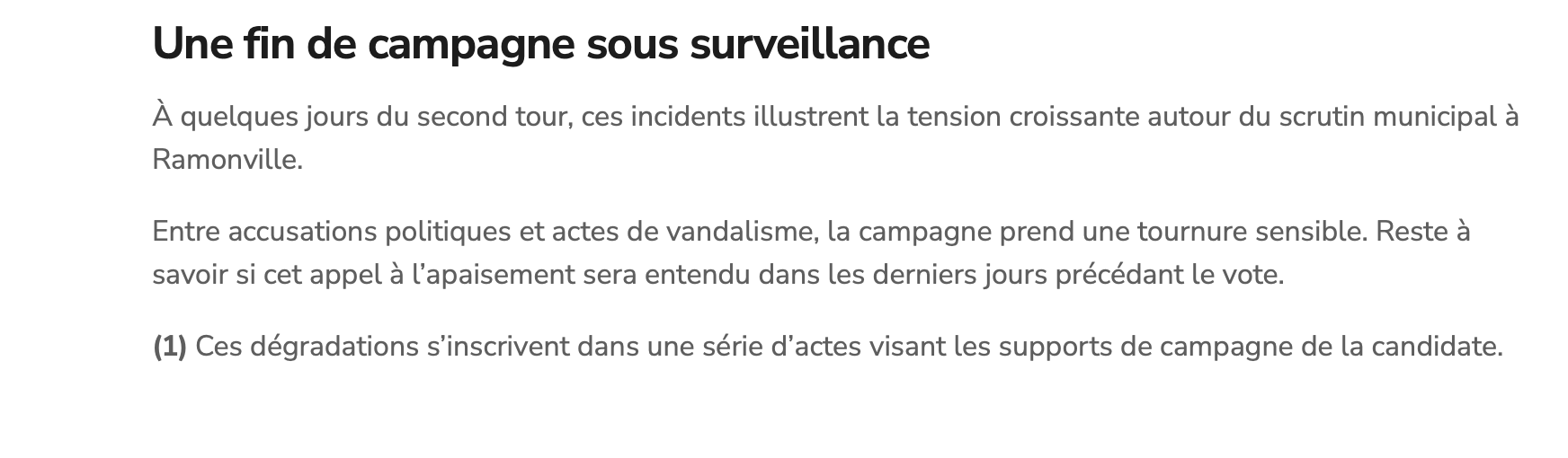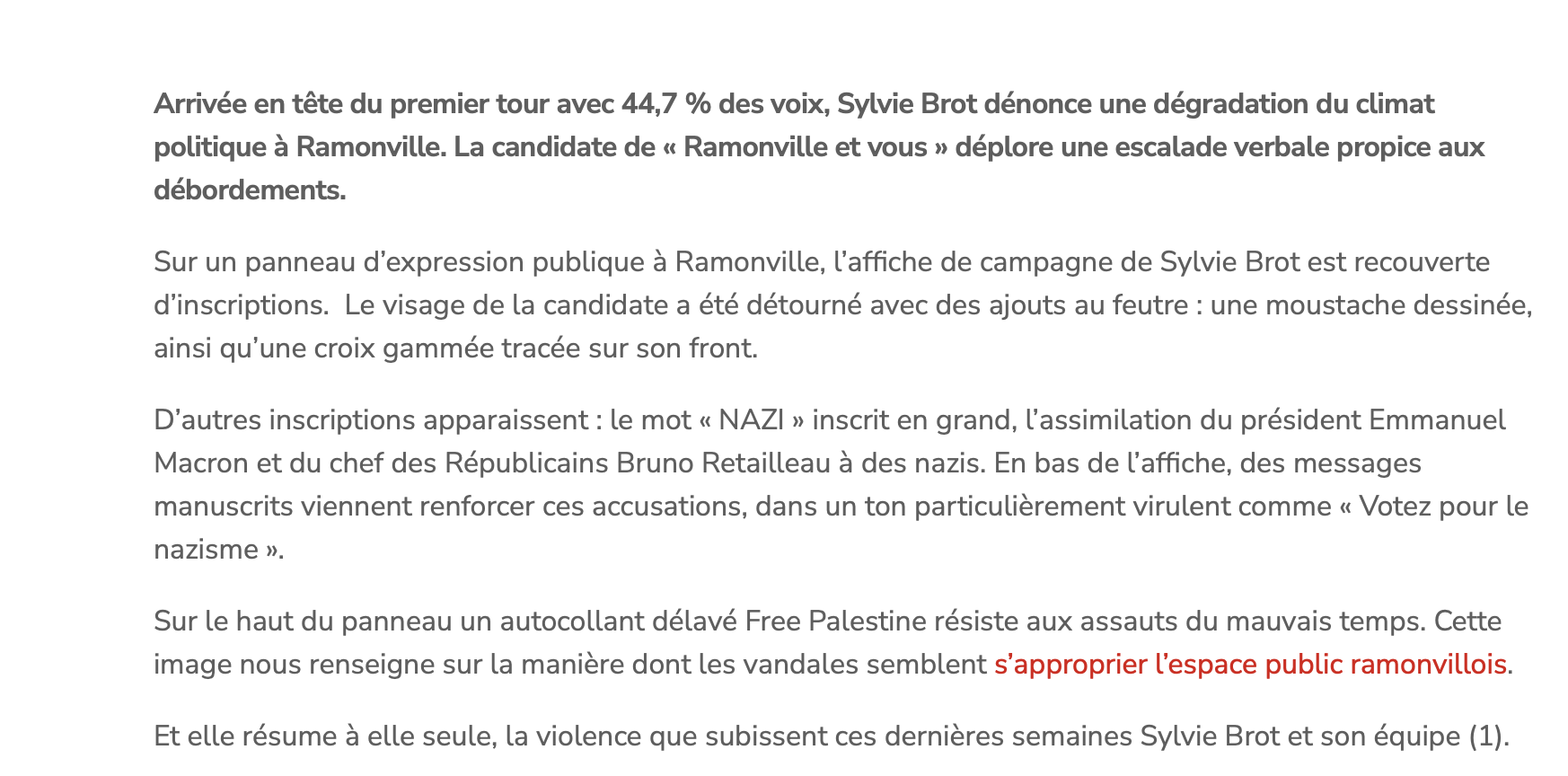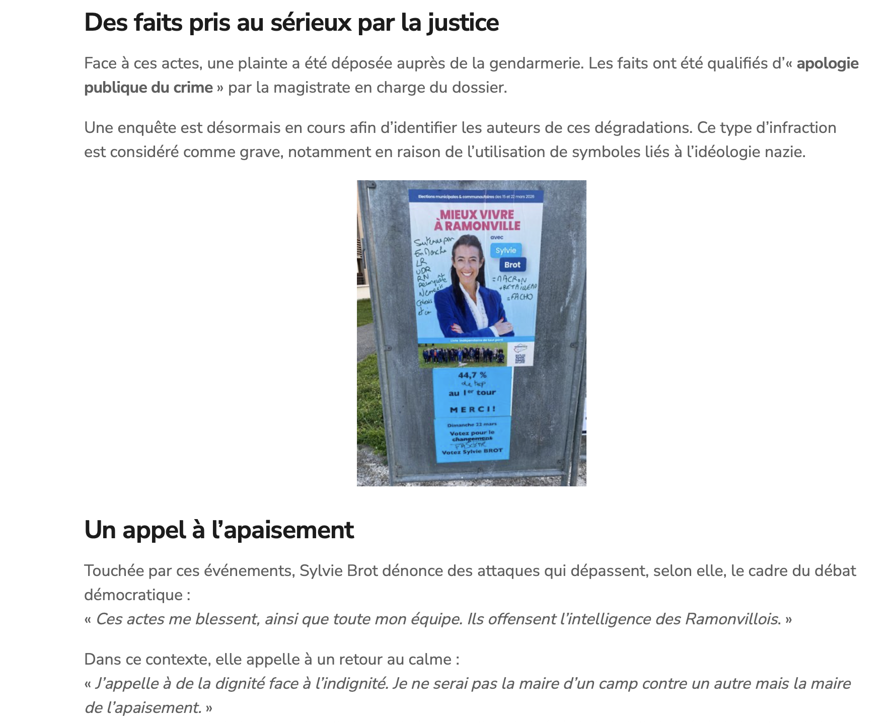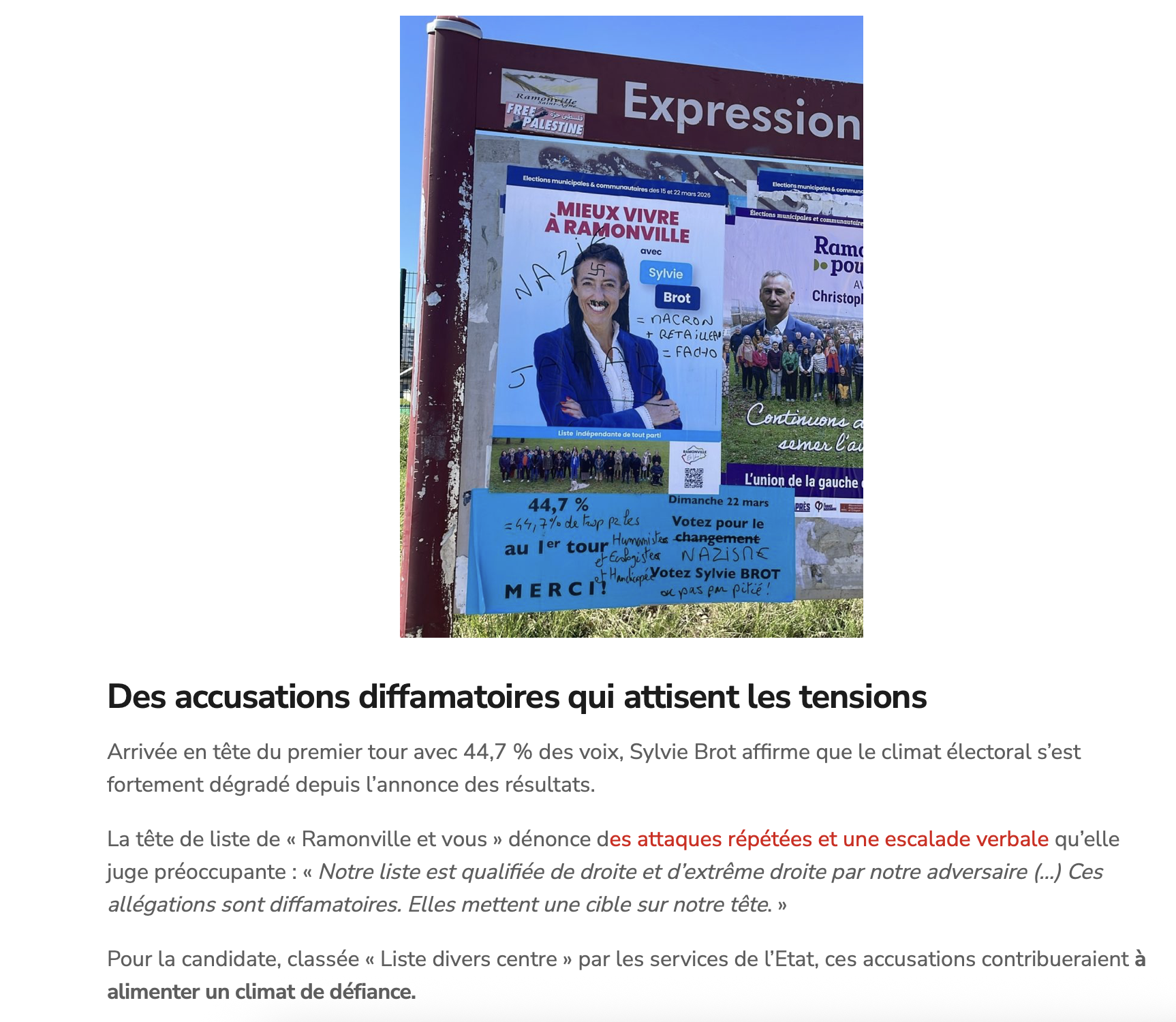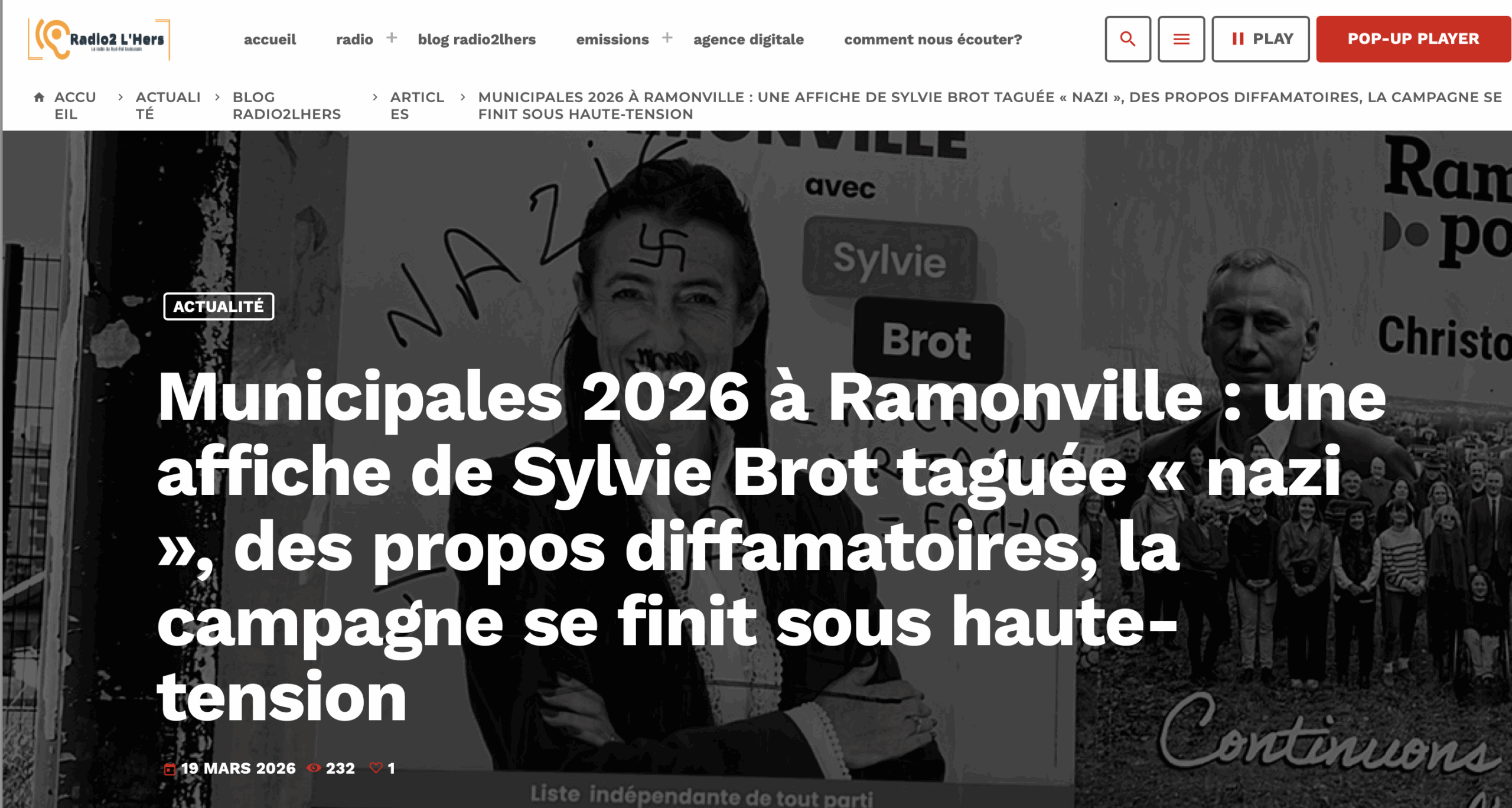 Radio2LHers, 19 mars 2026. https://radio2lhers.fr/municipales-2026-a-ramonville-une-affiche-de-sylvie-brot-taguee-nazi-des-propos-diffamatoires-la-campagne-se-finit-sous-haute-tension/